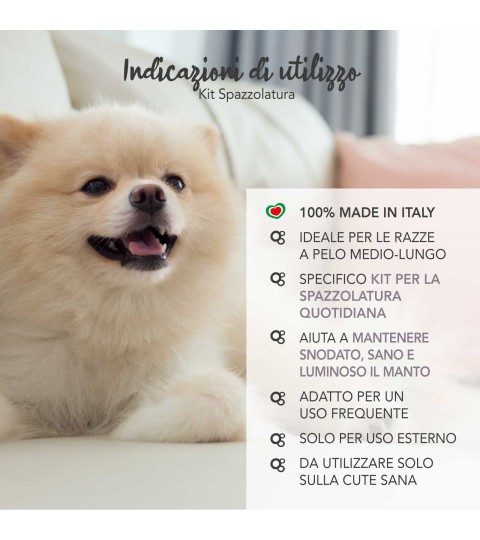 Detangling action without rinsing suitable for long coats, neglected and affected by knots and skeins, recommended as a maintenance product between one grooming and the other. Also ideal on shaved coats to polish and soften thanks to Vitamins C + E + Panthenol, Quaternized Keratin and Linen and Bamboo extracts. Suitable for the dog and the cat.