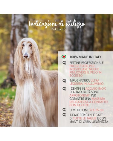 Ultra-light aluminum handle for maximum comfort and rounded stainless steel teeth arranged in areas of varying density along the comb for optimal results on all types of fur.