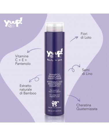 Yuup! shampoo for white and light coats is an ideal product for our pets, suitable for external use only and to be used exclusively on healthy skin.