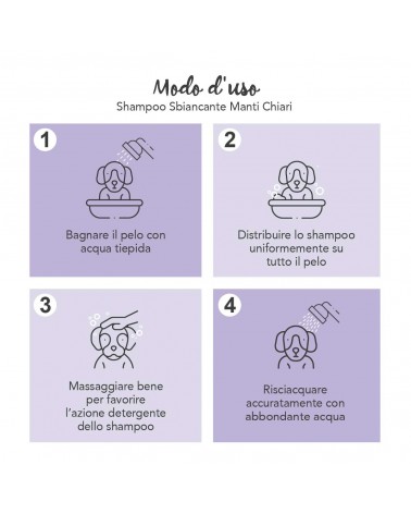 Wet the coat with lukewarm water and distribute the product evenly, avoiding contact with eyes and mucous membranes. Massage thoroughly to enhance the cleansing action, then rinse with plenty of water.