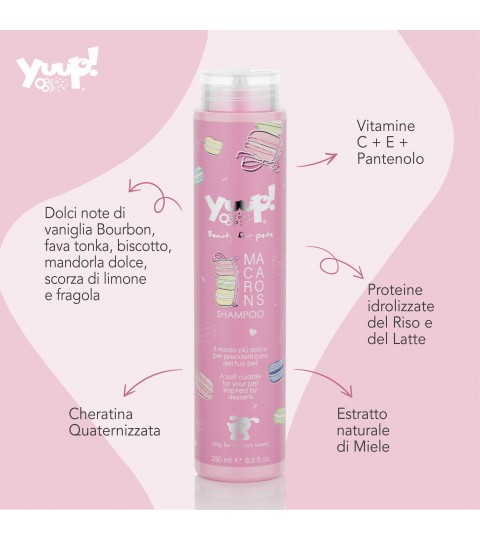 El Macarons Champú Yuup! es ideal para el cuidado de nuestros amigos de cuatro patas. Solo para uso externo. Usar exclusivamente sobre piel sana.