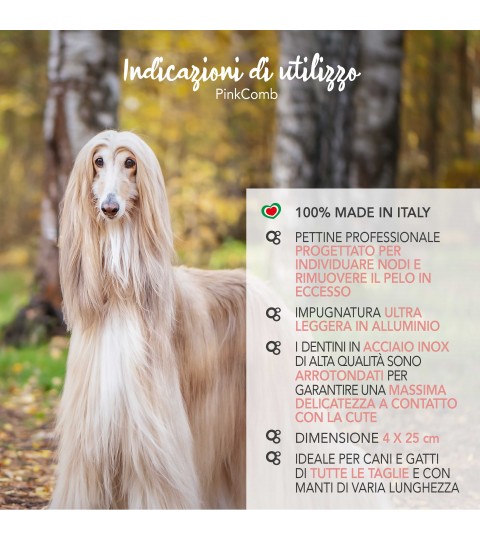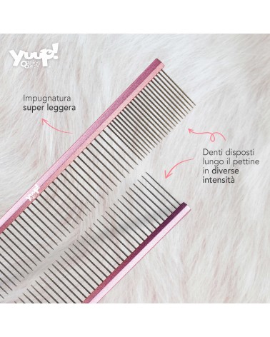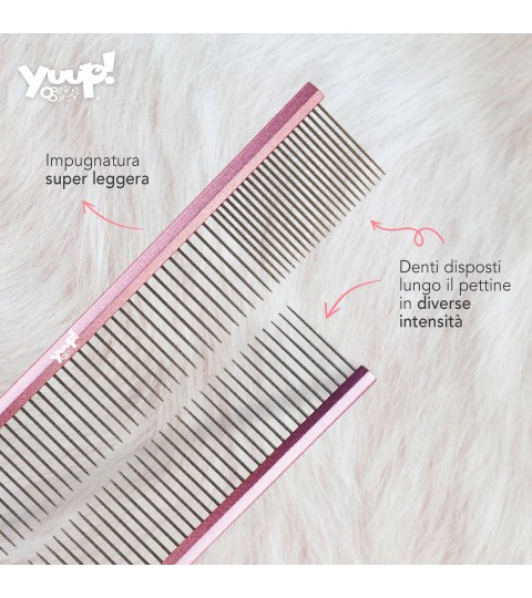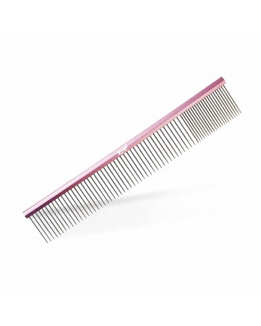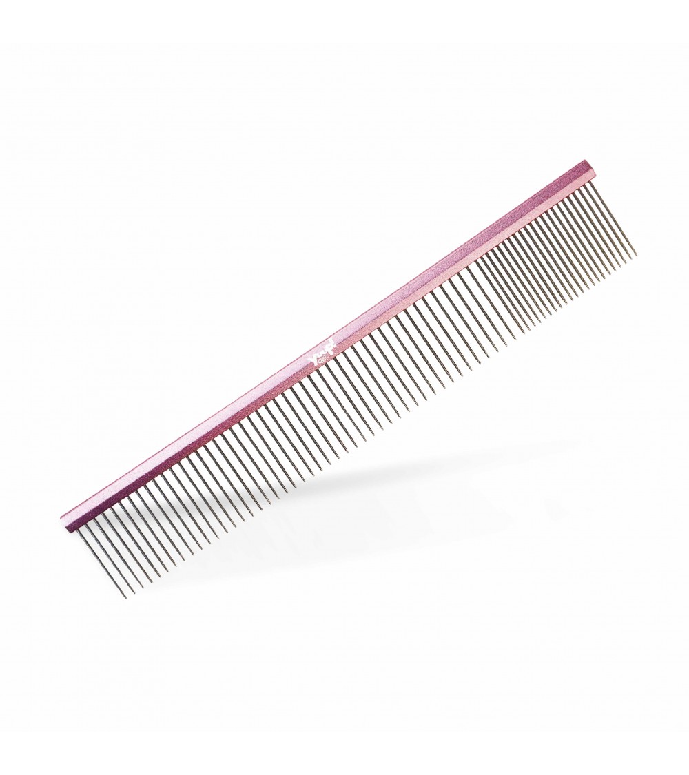 Mango ultraligero de aluminio para mayor comodidad y dientes redondeados de acero inoxidable dispuestos en zonas de distinta densidad a lo largo del peine para obtener resultados óptimos en todo tipo de pelaje.
