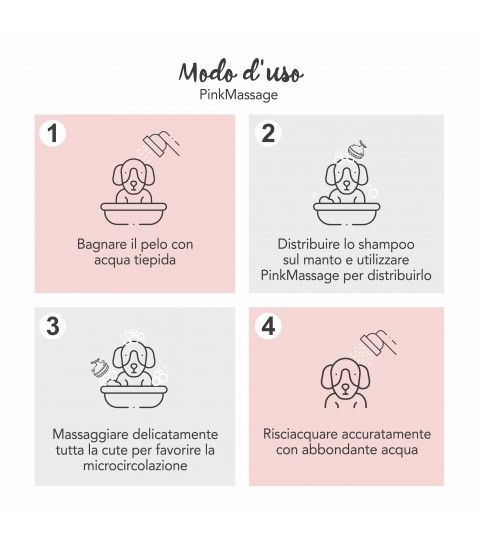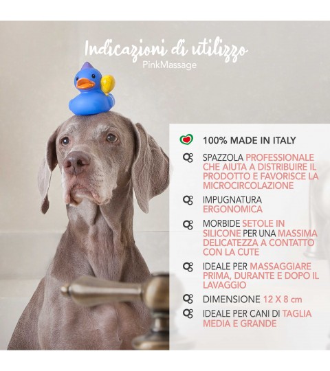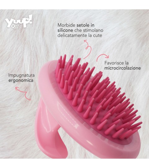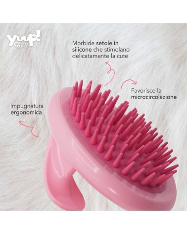 El PINKMASSAGE es un cepillo masajeador profesional diseñado para ofrecer una experiencia de grooming suave y eficaz. Gracias a sus suaves cerdas de silicona, estimula delicadamente la piel, favoreciendo la microcirculación y mejorando la distribución de champús, acondicionadores y tratamientos durante el baño.