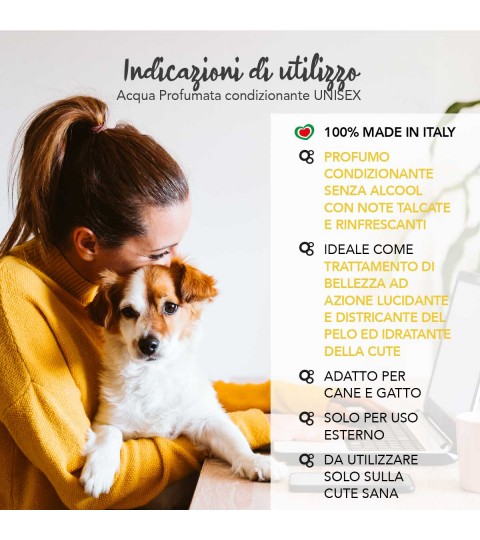 Una solución versátil, adecuada para todas las razas, incluso aquellas con la piel más delicada, que puede usarse a gusto para un tratamiento de belleza inmediato y para dejar un perfume delicioso y duradero en nuestros peluditos.