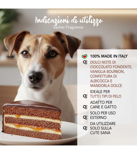 Una rica porción de tarta Sacher recién hecha, donde el chocolate se une al albaricoque: este es el viaje sensorial que ofrece la Sacher Fragrance, una experiencia gourmand que refresca y perfuma el pelaje con un efecto duradero.