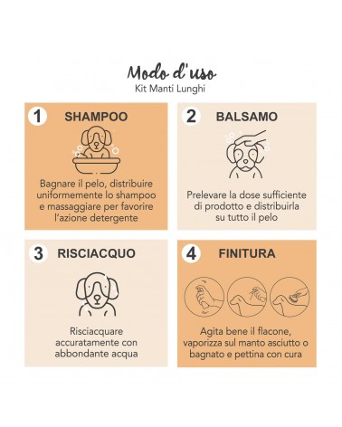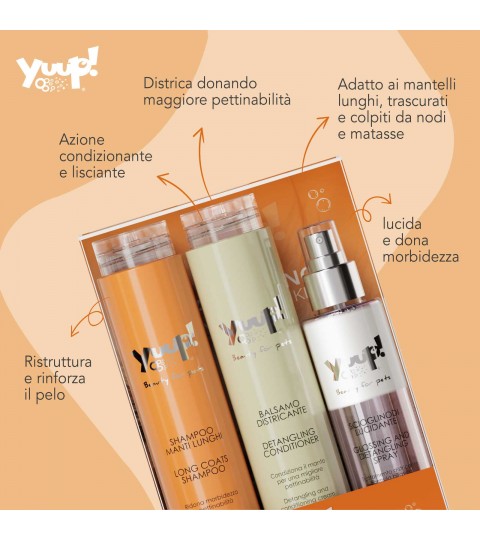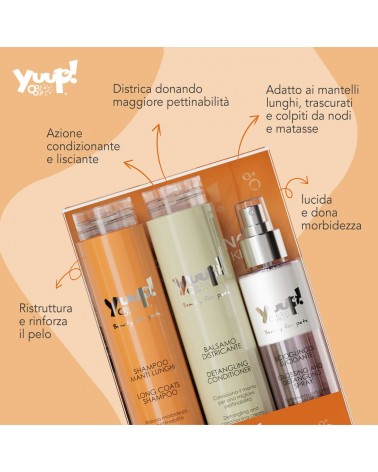 Ideal para las razas de pelo largo como el Bichón Maltés, Yorkshire, Shih-Tzu, Cocker Spaniel, Cavalier King, Galgo Afgano, Chihuahua, Golden Retriever; contiene los siguientes productos: