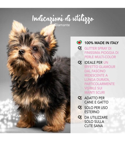 Glitter spray per cane e gatto. Una pioggia di finissime perle multi-color creata per regalare al manto del cane e del gatto una luce speciale dal tocco glamour e dal fascino iridescente a lunga durata. Adatto per tutti i tipi di manto e particolarmente visibile nei neri e scuri. Perle utilizzate nel make-up umano.