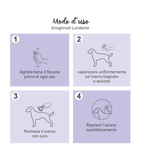 Se ti stai chiedendo se si può usare sui manti rasi, la risposta è assolutamente sì, perché il prodotto oltre all'azione districante vanta anche un’azione lucidante e ammorbidente, grazie agli ingredienti specifici e agli estratti botanici di altissima qualità.