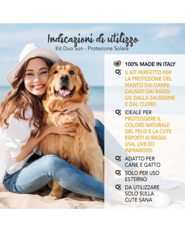In estate i nostri amici pelosetti hanno bisogno di un’extra protezione dai raggi solari, per questo puoi contare sul Duo Sun. È un cofanetto che contiene due prodotti specifici per proteggere il manto dei cani e dei gatti dai danni causati dai raggi UV, dalla salsedine e dal cloro.