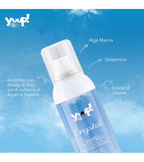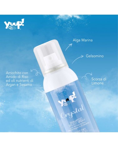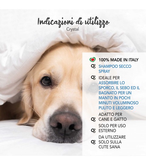Shampoo secco spray per cani e gatti. Assorbe lo sporco, il sebo ed il bagnato per un manto in pochi minuti volumimoso pulito e leggero. Arricchito con olii nutrienti di Argan e Sesamo. Ideale per tutti i tipi di manto e come prodotto da ring in qualsiasi condizione.