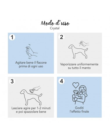 MODO D’USO: agitare bene prima dell’uso. Vaporizzare sul manto, lasciare agire 1-2 minuti e quindi spazzolare accuratamente. Non macchia e non lascia residui.
