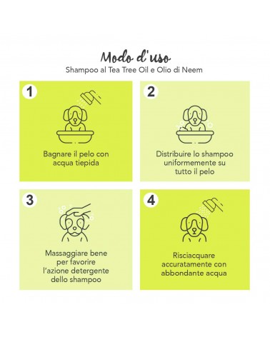 Bagna il pelo con acqua tiepida e distribuisci il prodotto in modo uniforme su tutto il manto, evitando occhi e mucose. Massaggia bene per favorire l’azione detergente dello shampoo e poi risciacqua accuratamente con abbondante acqua.