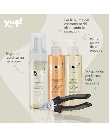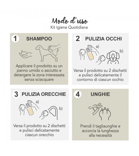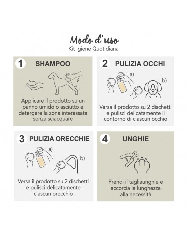 Il kit di prodotti e strumenti ideale per la routine di igiene quotidiana di pelo, occhi, orecchie e unghie, prodotti pratici e facili da usare e senza risciacquo.