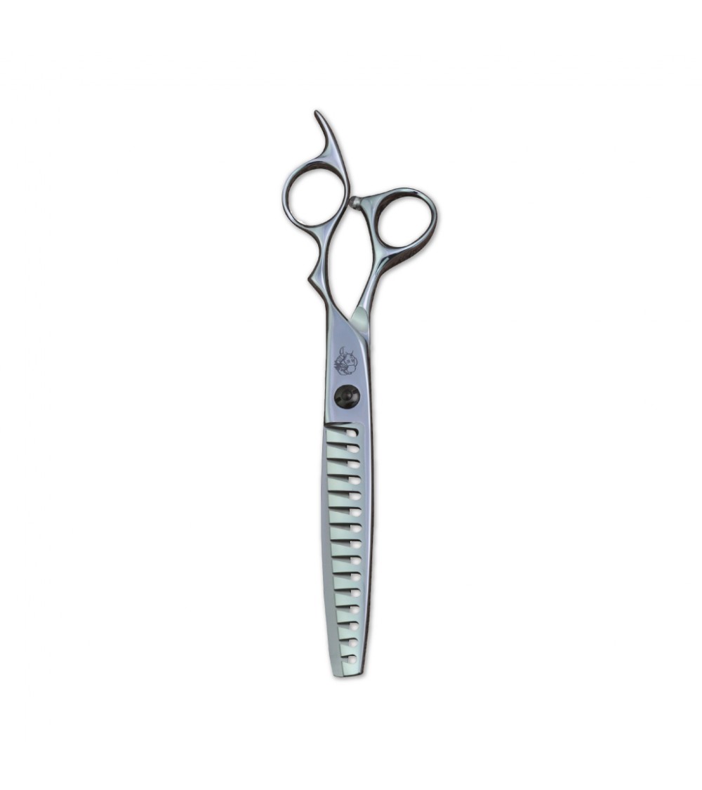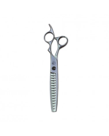 La Forbice Chunker Dritta Serie Geisha è un utensile professionale di alta qualità, realizzato in acciaio giapponese VG10, che garantisce un taglio preciso e duraturo. Con una dimensione di 7" (18 cm) e dotata di 15 denti, questa forbice è progettata per il chunking, una tecnica di taglio che rimuove il pelo in eccesso in modo strategico per creare un effetto naturale e sfumato nel manto dell'animale.