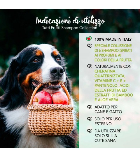 Una speciale collezione di 6 shampoo in formato 30ml per cane e gatto adatti a tutte le razze ed ispirati ai profumi e ai colori della frutta: Fragola, Banana, Mela Verde, Ananas, Ciliegia e Arancia.